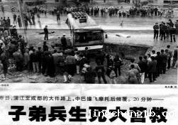 首先,利用实物投影仪直接投影出报纸上的新闻图片(如右图所示),并利用多媒体同时播出事先制作的声音文件:10月27日上午,在蒲江寿安镇插旗村3组机耕道与大件路连接处,一辆牌照为川A33711的客运中巴载着15名乘客正高速从蒲江往成都方向行驶,突然,公路右边的机耕道上冲出了一辆摩托车,在躲避不及的情况下,中巴车撞飞摩托车,最后翻倒在公路外的水沟旁,并导致摩托车驾驶员当场死亡,中巴车上两名乘客在车祸中丧生,十多名乘客受伤。读完新闻,设问:如果你是一名交警,根据中巴的刹车情况能否判断中巴车在大件路上的行驶是否违规?至此,学生思想活跃,为后面的教学奠定了基础。