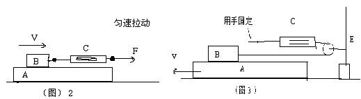 个物体对另一个物体表面的垂直作用力成正比。如果用F表示滑动摩擦力的大小,用FN表示压力的大小,则有F=µFN”。 如果我们老师本着“如何教教材”,而不考虑“如何实现课程目标”、“如何达成内容标准”,“如何为学生后续发展服务”,那么就非常容易丢失一次科学方法、探究学习培养的好机会。关于这部分内容我们是这样处理的:(1)构筑平台 定向引导。首先让学生完成如图2所示的实验,(图2中:A为长木板,B为滑板,C为弹簧秤),请学生汇报各组的读数,介绍读数所依据的原理(初中的二力平衡知识),然后师生交流读数不够准确的原因,研究改进的办法。在教师的启发下,学生设计出图3