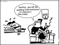 The picture shows that a wife is washing clothes and the husband is sitting in an armchair reading newspapers, smoking and saying: Oh, darling, put off the washing until tomorrow. Its Womens Day today.