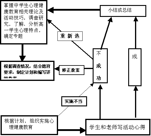 在实施心理健康教育活动的过程中,我严格按照设计的步骤进行。(步骤见附表一),此步骤严格按照管理学的相关原理进行,有理论指导,有活动设计与具体措施,同时有活动的反馈与监控。