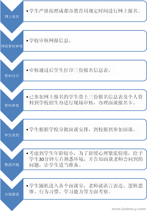 登陆成都招生考试网报名平台(www.cdzk.com)——→注册学生信息(上传电子照片)——→选择“北京师范大学成都实验” ——→网报确认成功后——→待学校审核通过——→打印三份报名信息表——→到学校现场确认审核。