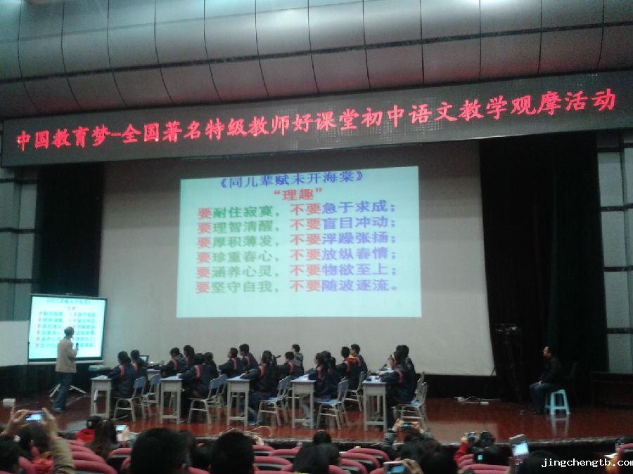 3月22日、23日由北师大教育培训中心主办的“中国教育梦——全国著名特级教师好课堂初中语文教学观摩活动在重庆召开,我校语文教师顾一萍、陈敏、吕琼梅、刘琢四人前往观摩、学习。全国著名特级教师徐杰、韩军、赵谦翔、黄厚江在现场都进行了示范课展示,并结合自己研究初中语文教育的心得分别做了“教材处理的原则、方法和艺术”“新语文、新课标与高效课堂”“绿色语文诗歌鉴赏”“语文教学的本色追求”的专题讲座。示范课上,特级教师们扎实与娴熟的功底、游刃有余驾驭课堂的能力让人佩服不已,所带来的专题讲座理论高屋建瓴,令人有如沐春风之感。高山仰止,景行行止,虽不能至,然心向往之。观摩学习后,我校语文教师都备受鼓舞,希望把名师的先进教育理念与自己的实践相结合,打造属于自己的高效课堂。