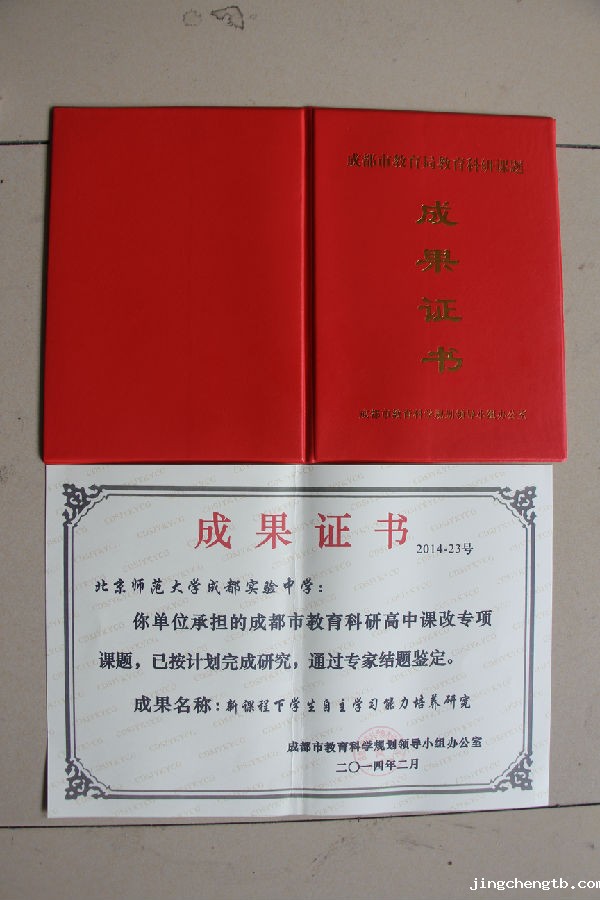 2014年4月,成都市教育科学规划领导小组办公室为学校颁发了2014-23号成果证书。