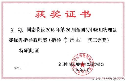 2016年4月,我校组织初二、初三学生参加了26届全国初中应用物理竞赛,经过校内初赛选拔,我校初中部95位同学代表学校参加了在树德实验考点的复赛,参加复赛的同学们充分发挥了自己学习上的优势,完美展示了弘毅学子的学习成果,取得了可喜的成绩。(初三年级的36位同学取得了全国三等奖1个、省一等奖6个、省二等奖11个、省三等奖18个;初二年级的59位同学取得了省一等奖4个、省二等奖9个、省三等奖46个)物理组王强、王光辉、凌锡帮、唐国淋、蒋都红、梁翠梅、张彬等获得优秀指导教师奖、受得了竞赛组委会的表彰。