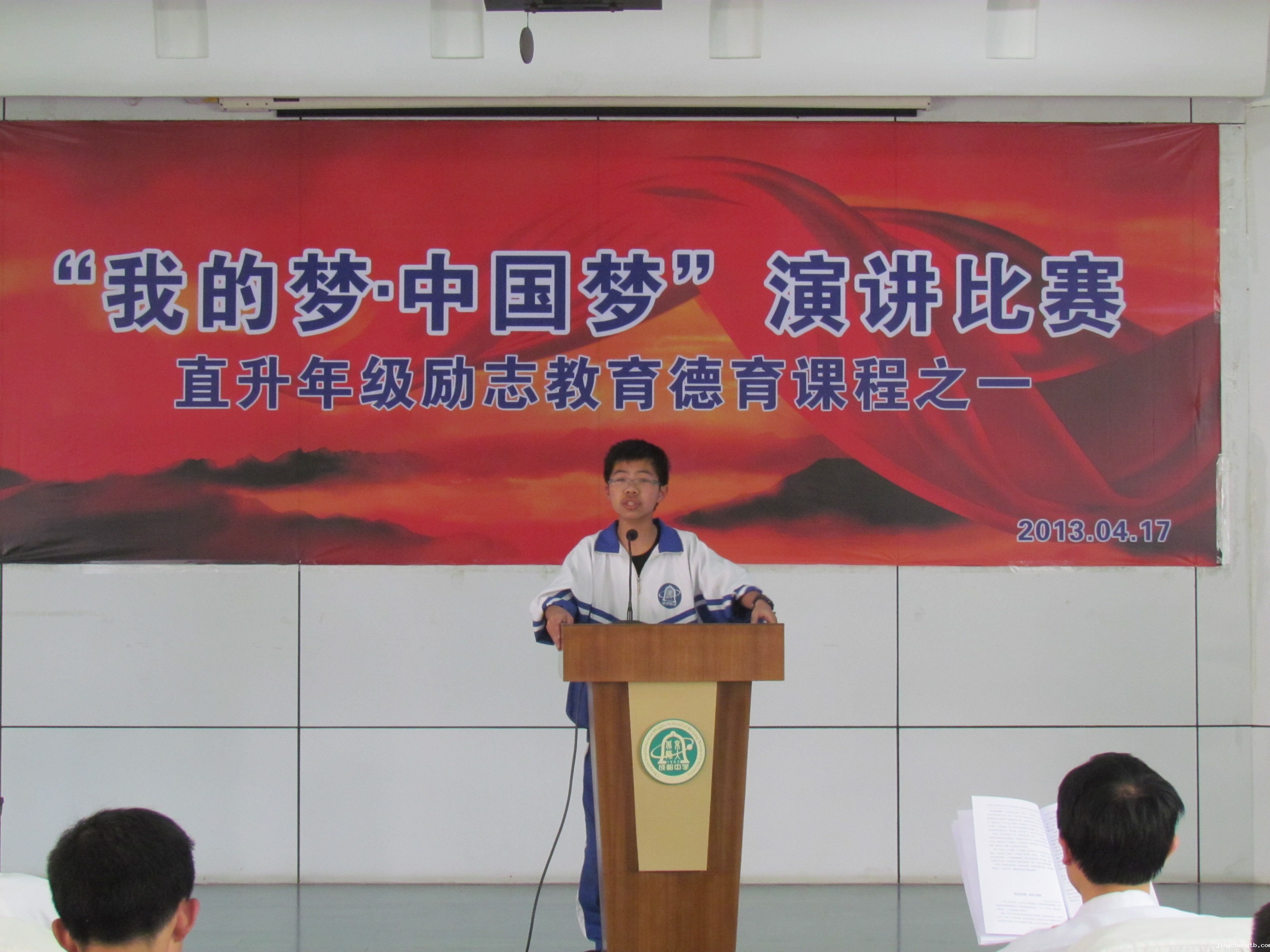 比赛正式、隆重而盛大,鲜红的“我的梦·中国梦”六字映入每个人的眼帘,而选手们更表现出自己火红的“中国心”。选手们个个准备充分,有的慷慨激昂,有的温文尔雅,有的虽紧张而不忘镇定,内容虽浅显而不掩其一片赤诚。最后,来自直升2班的陈乐天同学获得了第一名。
