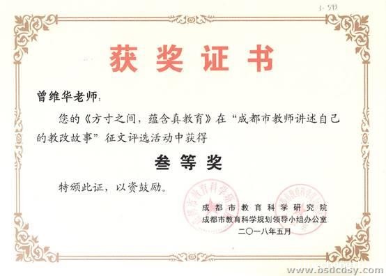 在本次活动中,我校曾维华老师讲述了《方寸之间,蕴含真教育》的故事、陈敏老师以《成长路上,你不孤单》讲述了育人的小故事、凌洁老师讲述了对学生《耐心点,再耐心点》的故事、袁蕾老师讲述了自己《用爱浇铸为学困生披上自信的“铠甲”》的故事、周华敏老师用《和风化雨解春寒》讲述了自己在学生青春叛逆期如何进行家校共育的故事。五位老师在对自己在教改中的某一次探索、尝试、变革经历的总结的基础上,精妙、精炼的讲述了一个个小而“真”的教育故事,在他们的故事中,蕴含着对教育改革的启迪和比较有深度的思考。这些故事都获得了评委的认可,均获得了“成都市教师讲述自己的教改故事”评选活动三等奖。