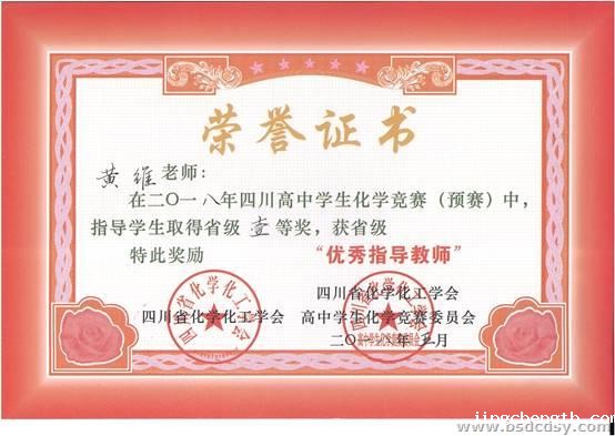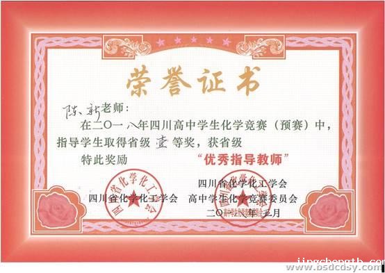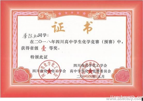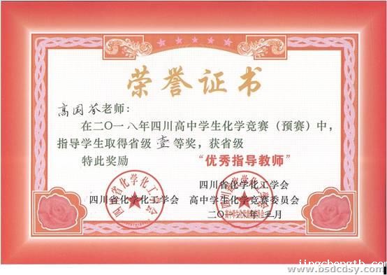 在不久前结束的2018年四川省高中生化学竞赛(预赛)中,我校高一高二的部分学生参加了竞赛,107位学生获得了奖励,受到了四川省化学化工学会和四川省化学化工学会高中学生化学竞赛委员会的表彰。其中,季陈虹等18位同学获得省一等奖,陈鎬濬等53位同学获得省二等奖,谭卓睿等36位同学获得省三等奖。陈新、高国芬、陈莉等三位老师获得优秀指导教师奖。