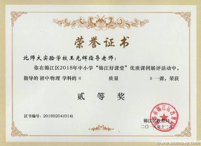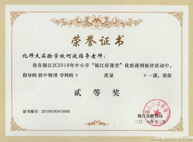 在锦江区2018年中小学“锦江好课堂”优质课例展评活动中,我校张彬老师执教的初中物理学科的《质量》一课荣获二等奖。何波、王光辉老师均获得指导教师奖。特向张彬、何波、王光辉三位老师表示祝贺。