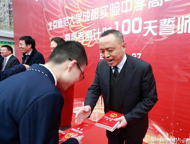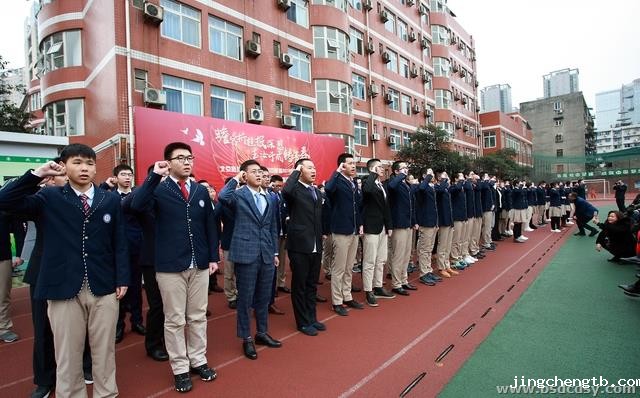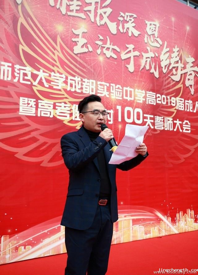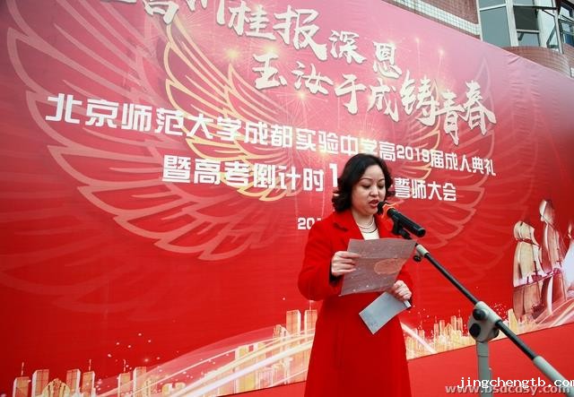十八而志,学生代表周连浩同学在上台发言中,用关键词的方式表达了他的思考:勇担责任,不摧眉折腰,不随波逐流。最后他用“凝神静气,戟鳞潜翼。斗志昂扬,筑梦远方”开始领誓。全体同学承诺:“肩负使命,心怀重托。挥汗百日,奋力拼搏。自律自强,百炼成钢。分秒必争,言出必行!”至此,高2019届“蟾宫折桂报深恩,玉汝于成铸青春”成人典礼暨高考倒计时100天誓师大会在激昂的誓言中完美落幕。