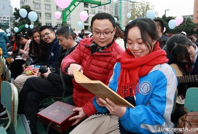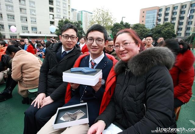 老师指引前行,父母则是坚实的后盾。同学们与父母互动的场景将大会推向了第一个高潮。一封书信,一纸浓情。同学们阅读完父母的书信以后,陈曦、段坤然、周连浩、方浩旭四位同学的家长分别上台发言,分享了与子女的温暖瞬间,并对孩子们给予了深切的期望。全体家长将精心准备的千纸鹤、手表、剃须刀等礼物送给孩子。感悟着父母深沉的爱意,许多同学早已眼眶湿润。父母与子女的深情拥抱,温暖了整个会场。