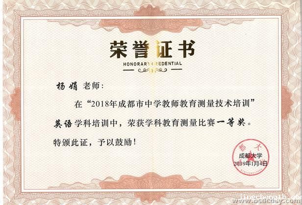 在 “2018年成都市中学教师教育测量与评价技术”英语学科培训中,我校杨娟老师荣获学科教育测量比赛一等奖,薛宇荣获学科教育测量比赛二等奖。两位老师均受到大赛主办单位成都大学的表彰。