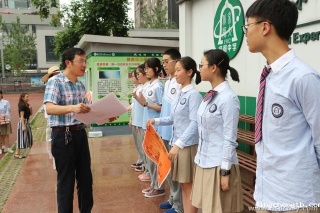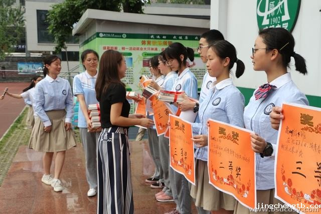 张文勇副校长宣布名次后,蔡怡主任和敖德兵主任为获奖班级颁奖。本次比赛的一等奖由高二.3班、高二.1班获得。高一.1班和高一.2班荣获二等奖,高一.3班、高一.4班、高二.2班和高二.4班荣获三等奖。此次活动,华星路社区也为每个获奖班级送出书籍,表达对同学们的祝福与期望。