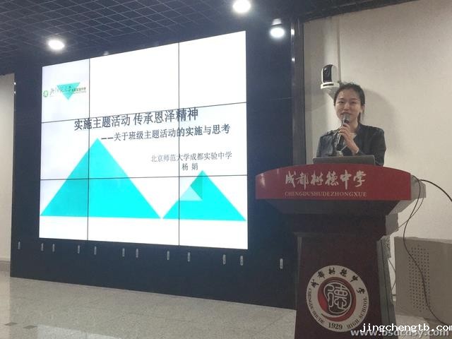 5月9日,由成都市教科院主办的成都市直属直管学校德育研讨活动在成都市树德外国语学校开展。本活动以“研究型班主任小专题研究——班级主题教育实施策略探究”为主题,学直属直管学校的八位骨干班主任进行了经验交流。我校初2017级恩泽班班主任杨娟老师代表我校以《实施主题教育 传承恩泽精神》为题进行交流发言。