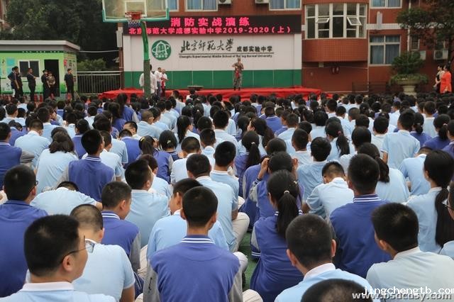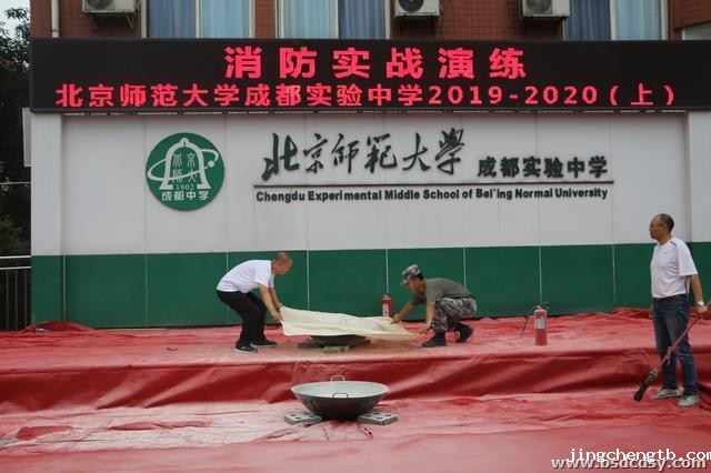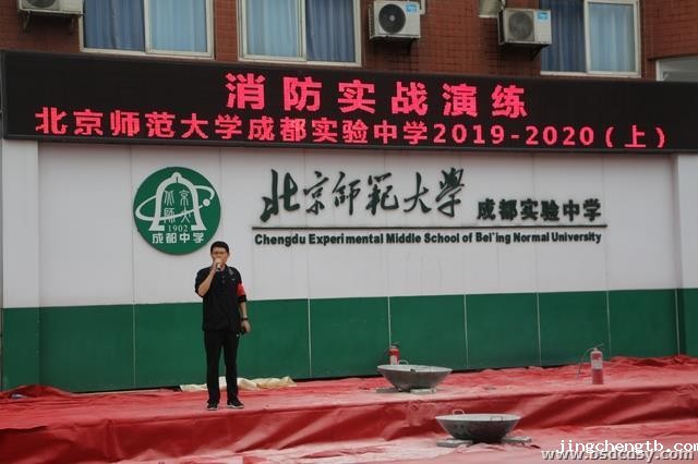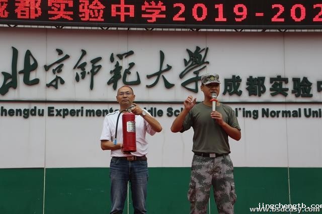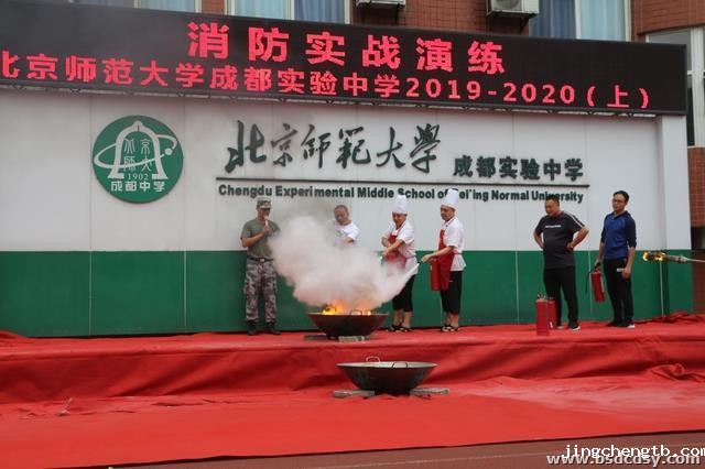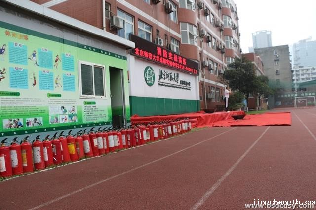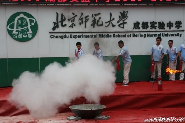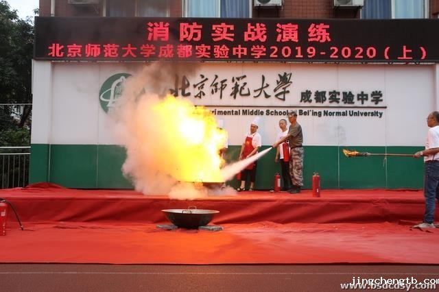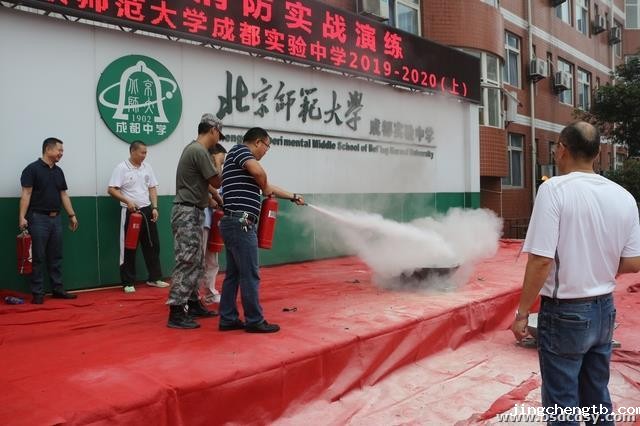 演练期间,巫剑老师向全校师生详细介绍了如何正确的使用干火灭火器,让师生更加深入的了解消防知识。现场准备了几十只灭火器,李国金老师点燃火盆,生活老师组、应急队员组、教师组、食堂人员组、学生安全委员组,依次上场,在巫老师指导下各自拿着灭火器成功完成了灭火任务。