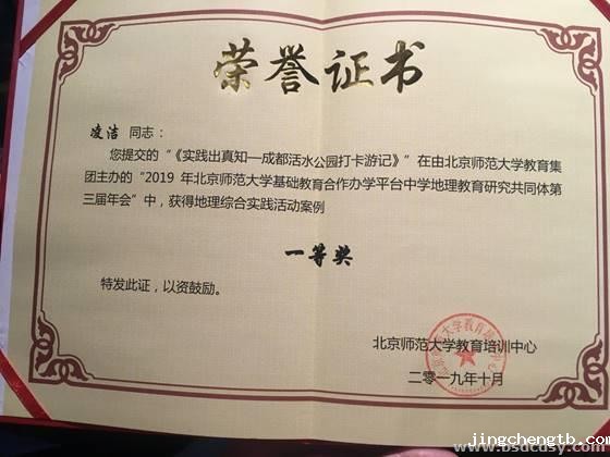 2019年10月26-28日,我校地理教师向光荣和凌洁代表地理教研组参加了在北京师范大学良乡附属中学举办的以“落实核心素养,强化综合实践”为主题的“2019年北京师范大学基础教育合作办学平台中学地理教育研究共同体第三届年会”。凌洁老师在大会上以《发现生活美好,回归地理真实》为题展示交流了我校开展地理综合实践活动的情况,她提交的《实践出真知----成都活水公园打卡游记》案例获得与会专家和同行的一致好评,最终摘取了地理综合实践案例的一等奖。
