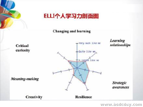 接着,赵博士通过学习力的内涵与要素两个方面讲述了什么是学习力。在结合学习力三要素说、哈佛六要素说和ELLI的七维度说的核心观点的基础上,赵博士通过ELLI的学习力七要素从七个维度[变化和学习(Changing and Learning)、关键好奇心(Critical Curiosity)、意义形成(Meaning Making)、创造性(Creativity)、学习互惠(Learning Relationships)、策略意识(Strategic Awareness)、顺应力(Resilience)]鞭辟入里的讲述了什么是学习力,并介绍了对学生学习力七个维度进行测评之后的蜘蛛图(又称雷达图),通过这个统计图,我们就可以比较直观地看到学生学习力的优势和不足,因此研究学生的学习力在教学实践中颇具指导意义。