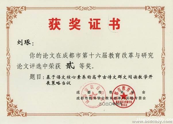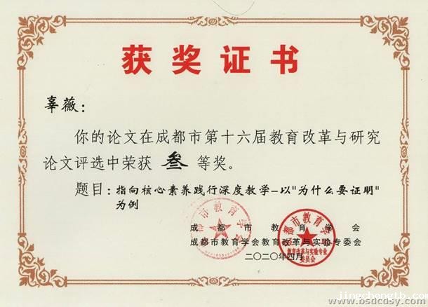 在“成都市第十六届教育改革与研究学术论文”评选活动中,我校推送的李江等老师的八篇论文经专家组评定,共获得二等奖两篇,三等奖六篇。