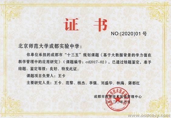 2017年12月,经成都市教育技术装备管理中心批准,由我校王卡副校长具体负责的《基于大数据背景的学力值在教学管理中的应用研究》的课题成为了成都市教育信息技术及教育装备研究课题“十三五”规划课题(课题编号为cd2017-02)。课题立项以来,在成都市教育技术装备管理中心的指导下,借助北京师范大学的高校资源,课题组在王卡副校长的组织下开展了大量工作,他们根据学校的教学管理实际情况,采用“大数据”的数据管理思想,较为系统的梳理近年来学生学业成绩,并在传统的分析方法基础上,依托统计学中数据离散程度的度量工具——“标准偏差”,重新分析认识学生的成绩,在不断的数据挖掘过程中,用实际统计结果直接验证一些教学经验、管理感觉、教育猜想,用分析数据变化的趋势较为准确的预测教学质量和结果。研究方法及相关成果为教师、学生更加高效的掌握学习情况、为教学管理工作的科学性提供更加完善的数据理论支撑。研究报告经专家组鉴定评审,以良好等级顺利结题,获得了成都市教育技术装备管理中心颁发的2020-01号结题证书。今后,我们将利用本研究成果做好教育管理,积极向兄弟学校推广研究成果,让教育信息技术装备更好更广的服务于学校的教学和教学管理工作。