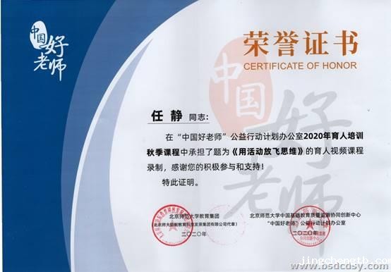 在“中国好老师”公益行动计划办公室2020年育人培训秋季课程录制中,我校任静老师承担了题为《用活动放飞思维》的育人视频课程。任老师用心的课程设计获得专家的好评点赞,北京师范大学教育集团和北京师范大学中国基础教育质量检测协同创新中心“中国好老师”公益行动计划办公室联合为任老师颁发了荣誉证书。