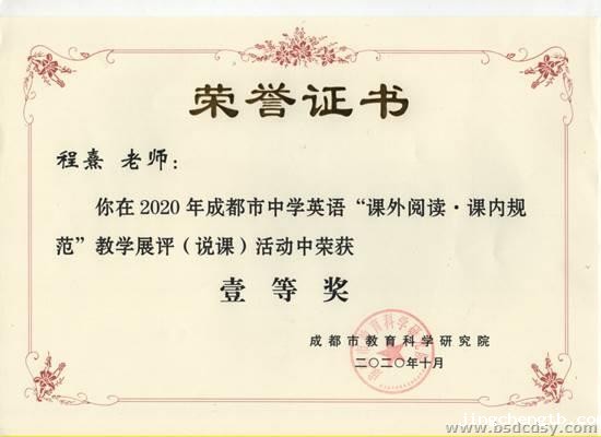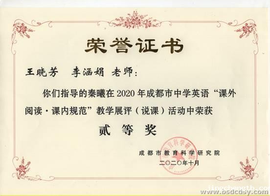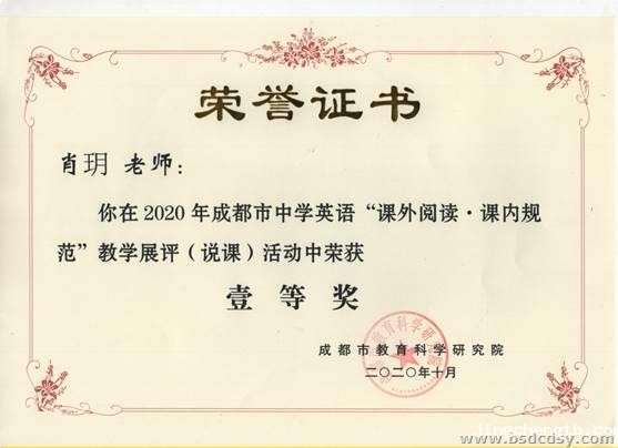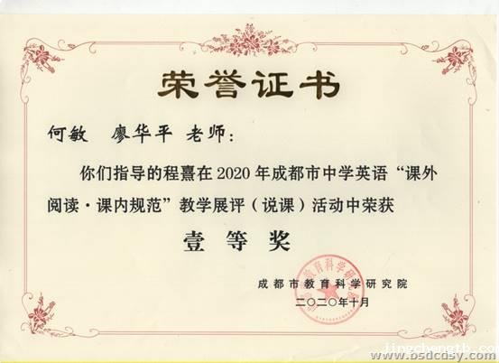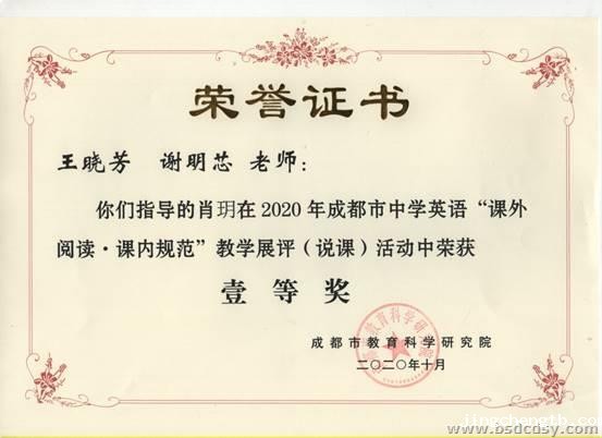 在2020年成都市中学英语“课外阅读﹒课内规范”教学展评(说课)活动中,我校程熹、肖玥两位老师分别抱回了大赛一等奖,秦曦老师获得大赛的二等奖。他们的指导老师何敏、廖华平,王晓芳、谢明芯,王晓芳、李涵娟分别获得指导教师一等奖、二等奖。以上老师这些成绩是在个人努力和团队合作的基础上取得的,也是我校多年来坚持学思课堂实践的成果,学校希望全校教师要继续深入进行学思课堂研究,不断地在实践中总结和反思,不断的提升自己驾驭课堂的能力,要在学思课堂研究的引领下,逐渐形成适合我校学生的、具有自己特色的教学风格,为把我校办成高品质的令人尊敬的学校而努力。