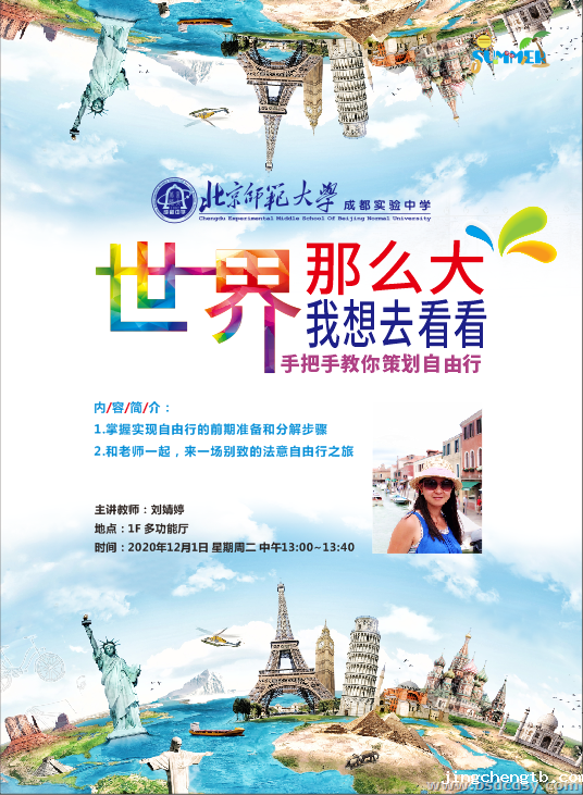 【初二6班 雷雨扬 报道】上周我校青年教师刘婧婷老师在四楼励耘厅进行了题为《世界那么大,我想去看看——手把手教你策划自由行》的专题讲座,来自各年级的同学们参加了活动。