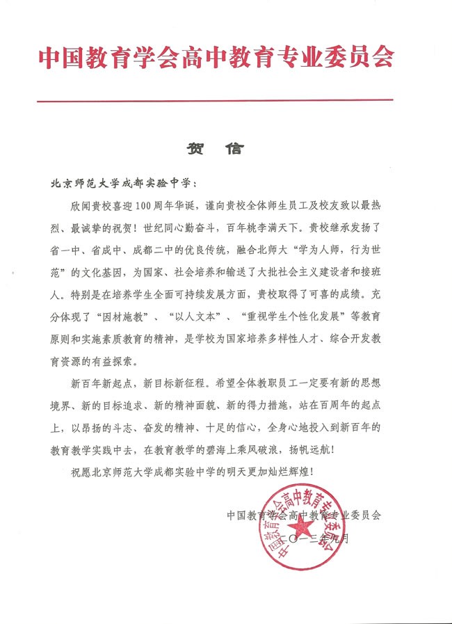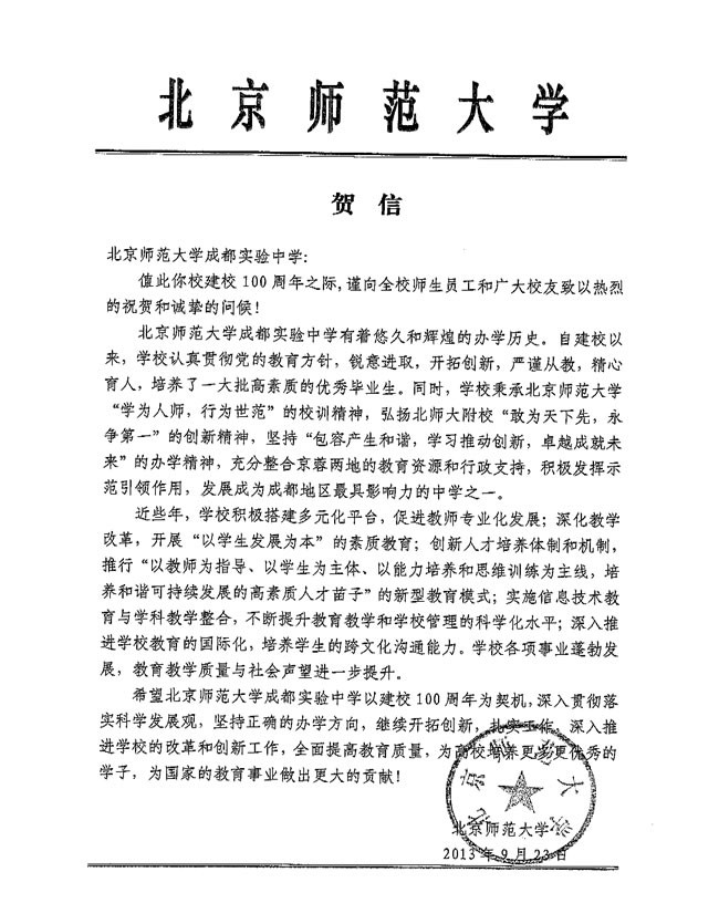 北师大国内合作办公室屈浩主任宣读了北京师范大学的贺信。在贺信中,北京师范大学校长董奇先生对学校的百年华诞表示热烈的祝贺,对各级领导、社会各界和全校师生为推动学校发展所做出的突出贡献表示诚挚的感谢。贺信对北京师范大学成都实验中学11年来的办学成绩给予了肯定,对学校未来的发展指明了方向。