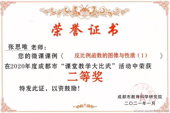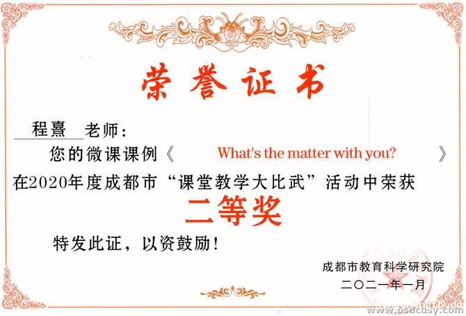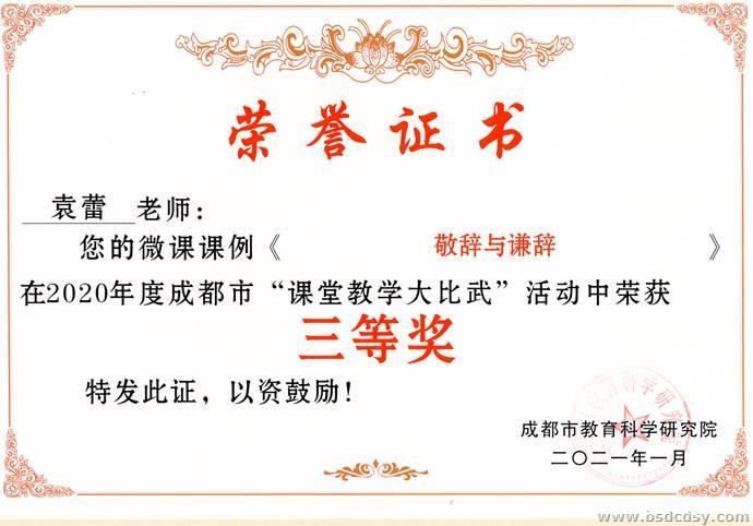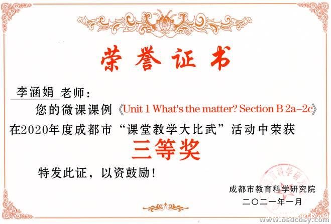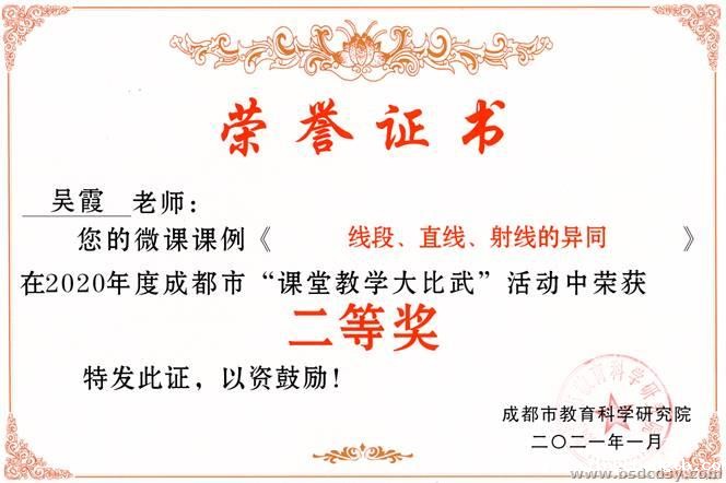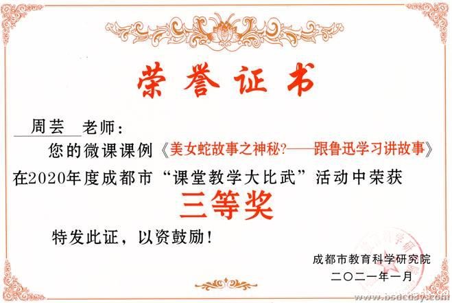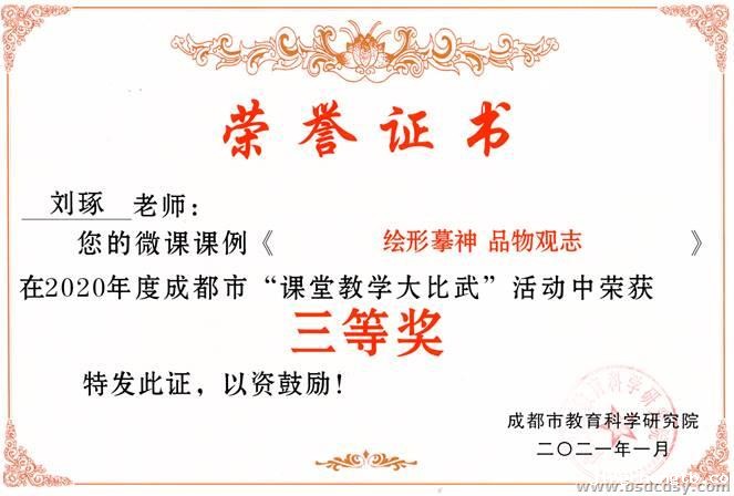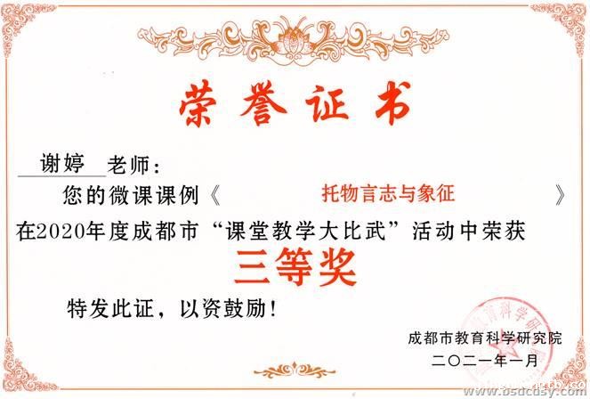 在成都市2020年“课堂教学大比武”活动的中,继我校教师在完课评比斩获成都市一等奖4个、二等奖12个、三等奖17个后,又传来微课评比的喜讯,杨娟老师参评的微课《形容词和副词的比较级》、程熹老师参评的微课《What's the matter with you? 》、吴霞老师参评的微课《线段、直线、射线的异同》、张思唯老师参评的微课《反比例函数的图像与性质(1)》、刘盛华老师参评的微课《人脸检测代码阅读》、邱太苹老师参评的微课《从三个方向看物体形状》等六个微课获得本次大赛的二等奖;谢婷老师参评的微课《托物言志与象征》、周芸老师参评的微课《美女蛇故事之神秘?——跟鲁迅学习讲故事》、张璇老师参评的微课《对比手法—以<邓稼先>为例》、李涵娟老师参评的微课《 Unit 1 What's the matter? Section B 2a-2c》、刘琢老师参评的微课《绘形摹神 品物观志》、袁蕾老师参评的微课《敬辞与谦辞》、熊继刚老师参评的微课《直线与圆的位置关系》、周华敏老师参评的微课《我国工业分布》、刘辉老师参评的微课《古代中国的农业经济》、黄霞老师参评的微课《代数式》等十个微课获得本次大赛的三等奖。