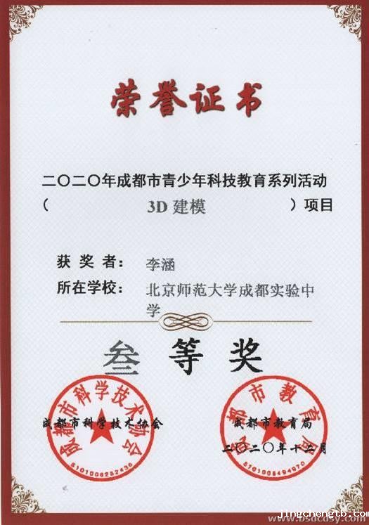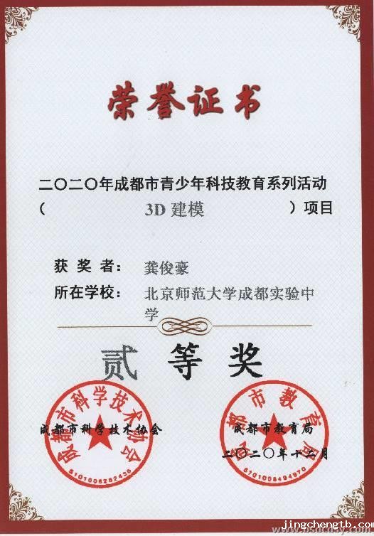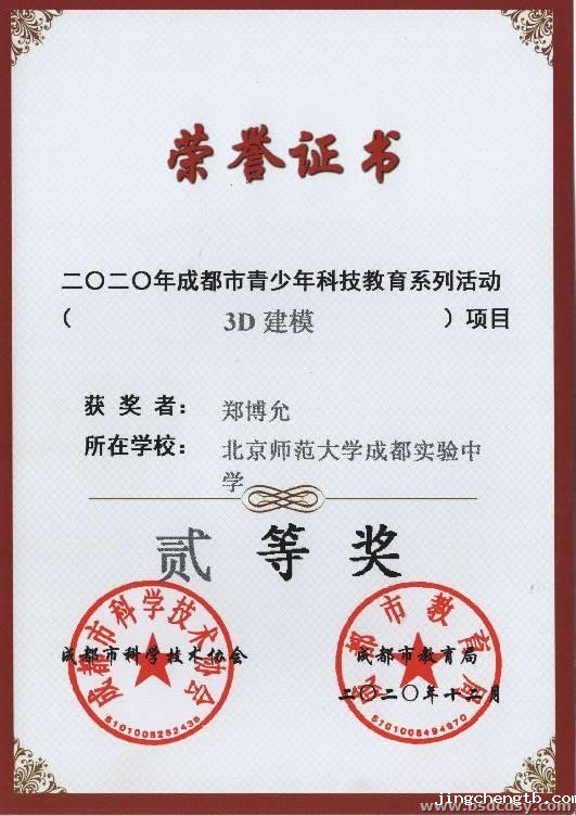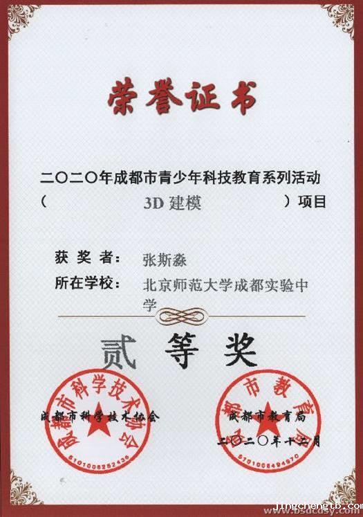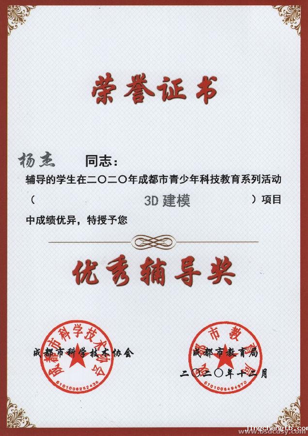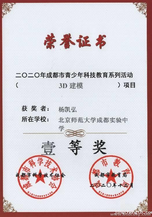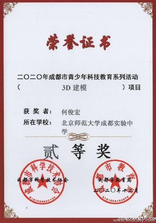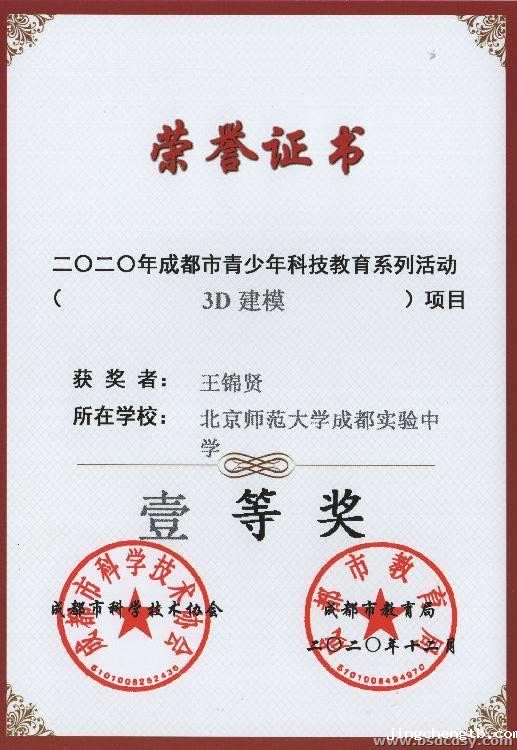 在2020年成都市青少年科技教育系列活动(3D建模)项目中,我校学生在杨杰老师的指导下,无中生有中想你所想进行创意,在智力与创造力的完美碰撞中完成创意建模,最终,杨凯弘、王锦贤两位同学斩获了大赛的一等奖,郑博允、何俊宏、龚俊豪、张斯淼等四位同学收获了二等奖,李涵同学获得了大赛的三等奖。指导老师杨杰获得“优秀辅导奖”。