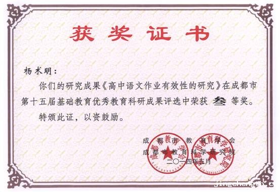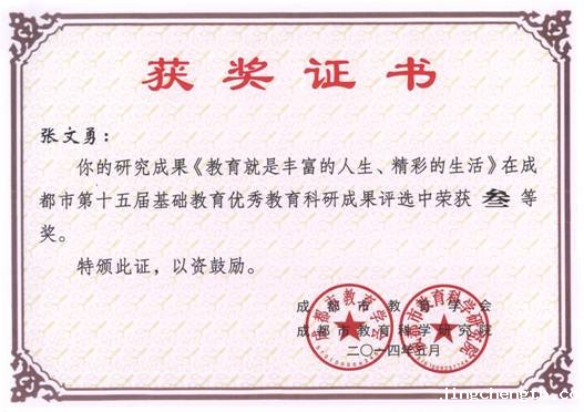 在成都市教育局和成都市教育学会联合举办的成都市第十五届基础教育优秀教育科研成果评奖活动中,我校张文勇、杨术明两位老师的科研成果《教育就是丰富的人生、精彩的生活》、《高中语文作业有效性的研究》分别获得优秀教育科研成果三等奖。