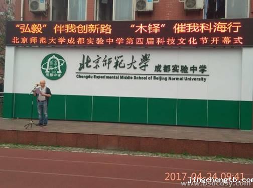 2017年4月24日,以“弘毅伴我创新路 木铎催我科海行”为主题的北京师范大学成都实验中学第四届科技文化节正式拉开帷幕。开幕式上,费安文老师在国旗下的讲话中,宣告本届科技文化节正式开幕,学生代表七年级二班孙涵通过国旗下的讲话表达了对科技文化节的渴望和积极参与科技文化节活动的豪迈气概。